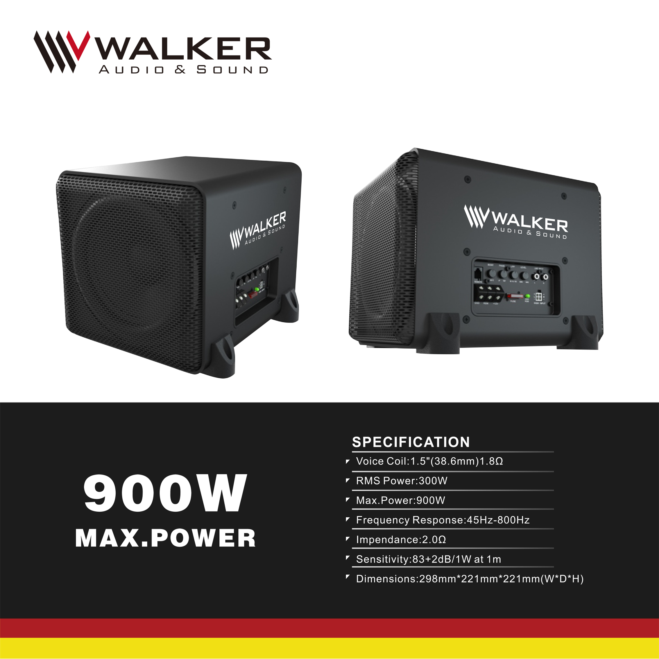 Discover the Walker WB-808A, a powerful subwoofer designed to deliver an immersive and impressive audio experience. With a maximum power of 900W, the WB-808A is the perfect choice for audiophiles looking to enhance their sound quality in various audio systems.